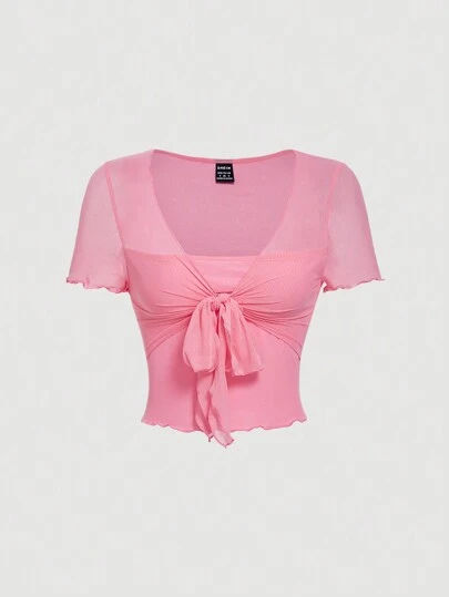 SHEIN MOD 女款纯色网眼拼接系带 T 恤 - 粉色 - 查看 1