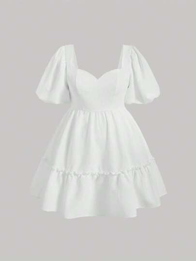 SHEIN MOD 大碼雞心領口泡泡袖荷葉邊洋裝 - 白色 - 查看 1