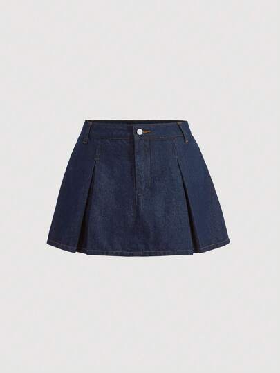 SHEIN MOD 素色褶皺細節牛仔裙褲 - 深色水洗藍 - 查看 1