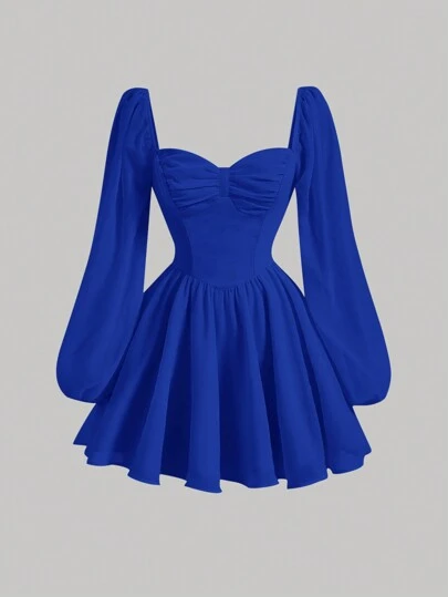 SHEIN MOD 雞心領口燈籠袖胸部褶皺洋裝 - 寶藍色 - 查看 1