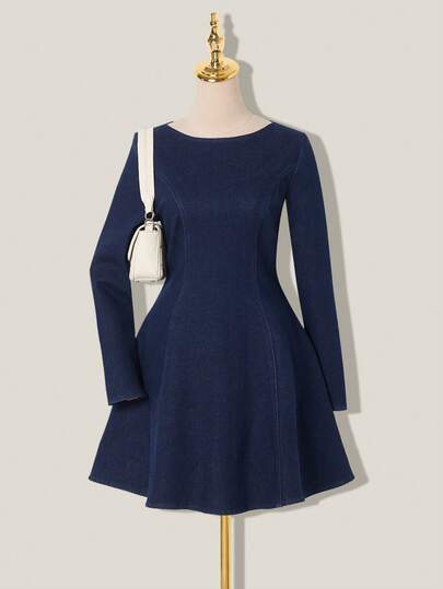 SHEIN MOD 女士休闲收腰牛仔连衣裙,带保暖内衬,冬季款 - 深色水洗藍 - 查看 1