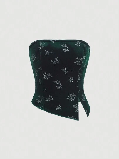 SHEIN MOD 女款花卉印花側開叉抹胸上衣 - 墨綠色 - 查看 1