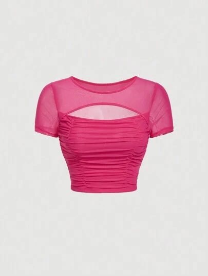 SHEIN MOD 女士空心褶皺網紗t恤 - 玫紅色 - 查看 1