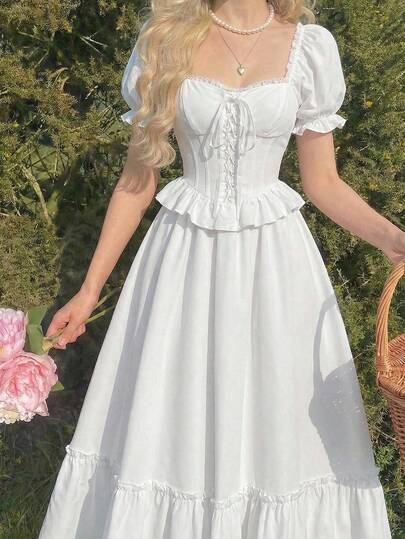 SHEIN MOD 泡泡袖方领系带超长连衣裙 - 白色 - 查看 1