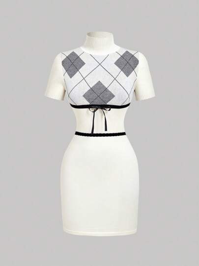 SHEIN MOD 女士菱形图案立领短袖紧身针织连衣裙 - 彩色 - 查看 1