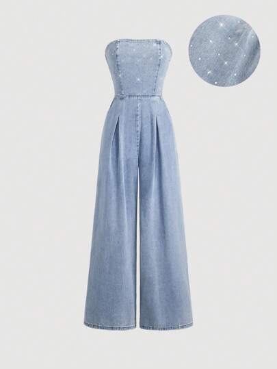 SHEIN MOD 女士简约牛仔抹胸连体裤,休闲日常穿着 - 藍色 - 查看 1