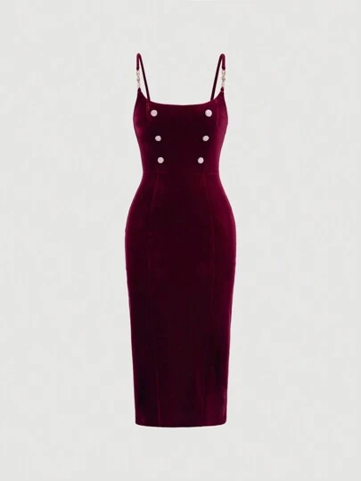 SHEIN MOD 女性瘦身鈕扣細節細肩帶連身裙 - 酒紅色 - 查看 1