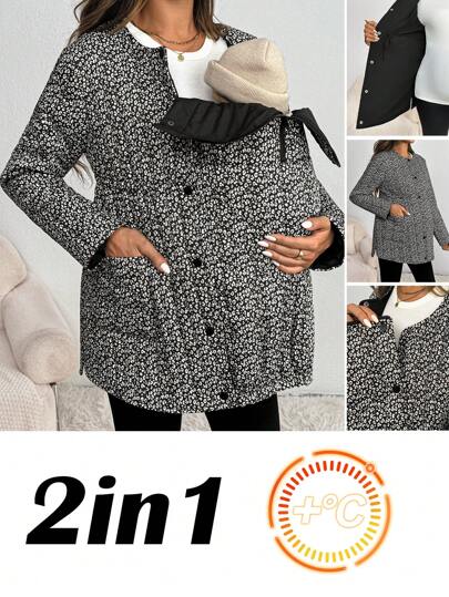 SHEIN 孕妇二合一毛绒碎花连帽长袖外套,冬季外套,外套,秋季 - 黑色 - 查看 1