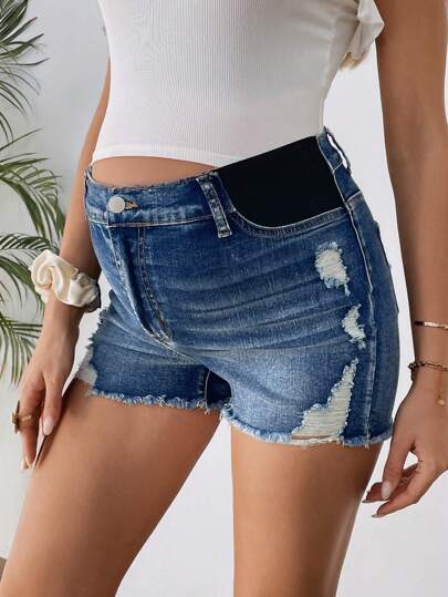 SHEIN 孕妇蓝色弹力破洞牛仔短裤,夏季 - 藍色 - 查看 5