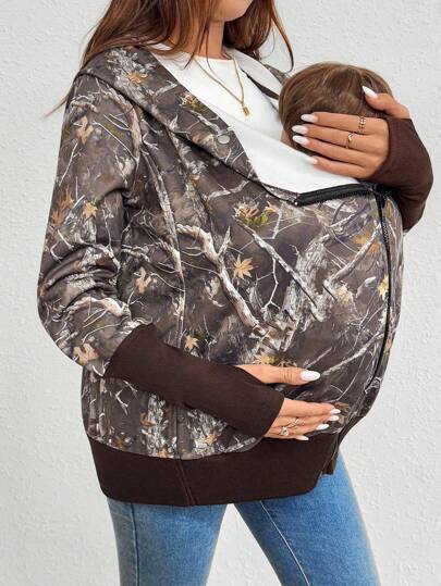 SHEIN 孕妇迷彩印花拉链三合一哺乳连帽外套 女式秋季服装 万圣节服装 - 軍綠色 - 查看 1