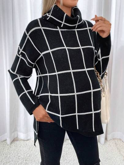 SHEIN 孕妇格纹高领落肩开衩下摆毛衣,适合冬季 - 黑與白 - 查看 5