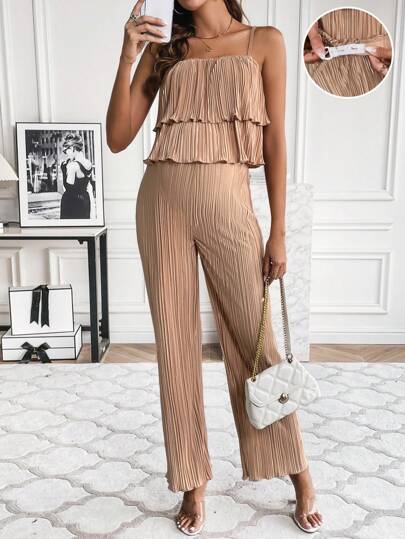 SHEIN 孕婦荷葉邊褶皺吊帶上衣&闊腿褲 - 杏色 - 查看 1