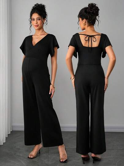SHEIN 孕妇纯色V领镂空休闲短袖连体裤 - 黑色 - 查看 1