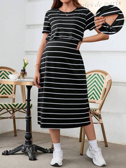 SHEIN 孕妇条纹圆领短袖休闲哺乳连衣裙,夏季 - 黑色 - 查看 1