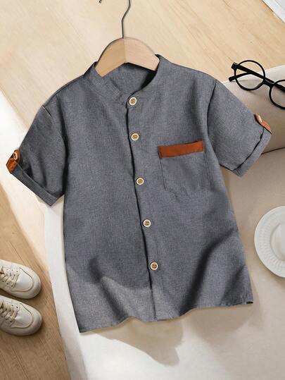 SHEIN Mirajuku 1件青少年男童立领纯蓝色休闲短袖衬衫,适合春夏穿着,百搭实用