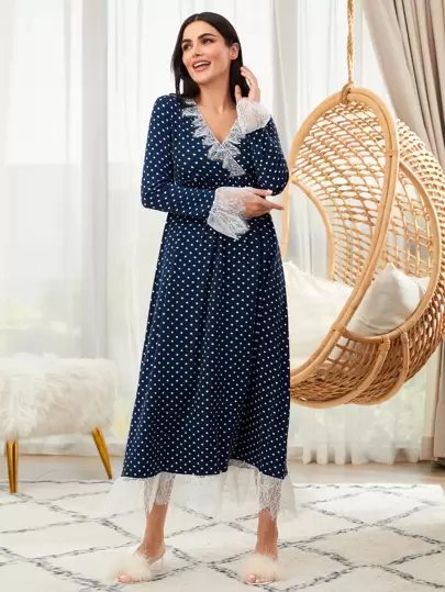 SHEIN Unity 波卡圓點蕾絲拼接休閒服洋裝 - 藏蓝色 - 查看 1