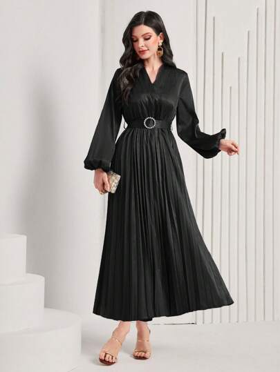 Modelyn 素色燈籠袖百褶下擺繫腰帶洋裝 - 黑色 - 查看 1