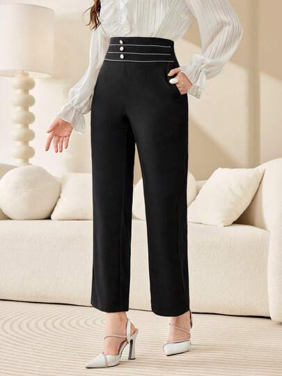 Modelyn 女款連結細節高腰寬褲 - 黑色 - 查看 1