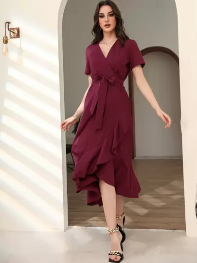 Mulvari 勃艮第红色荷叶边郁金香下摆束带连衣裙 - 酒紅色 - 查看 1