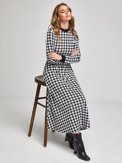 Mulvari 千鳥格印花高腰洋裝 - 黑與白 - 查看 1