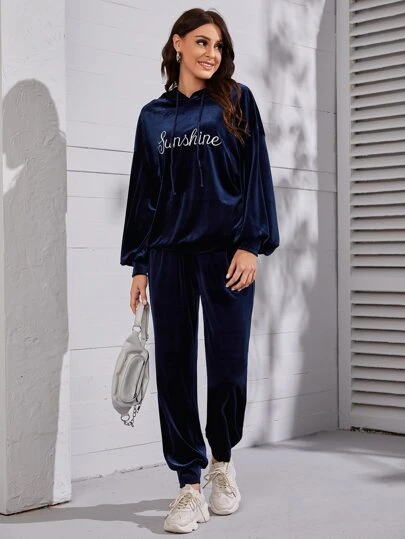 Mulvari 字母刺繡落肩袖抽繩絲絨連帽衫和衛褲 - 藏蓝色 - 查看 1