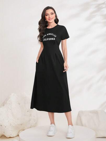 Seusyu 字母图案褶皱细节隐藏式口袋连衣裙长款女装 - 黑色 - 查看 1