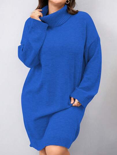 Mulvari 女士加大碼高領純色毛衣連衣裙 - 藍色 - 查看 1