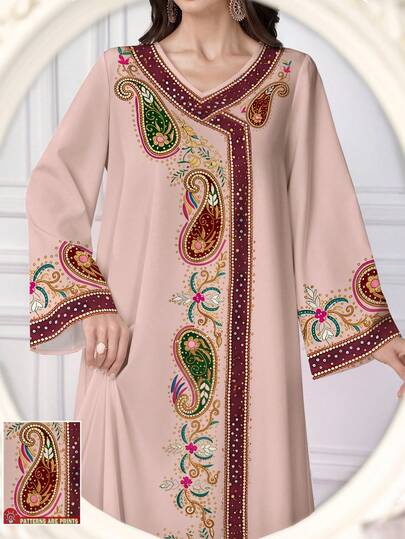 SHEIN Najma 腰果花几何刺绣印花V领女士长袖连衣裙,优雅阿拉伯时尚服饰,春夏款