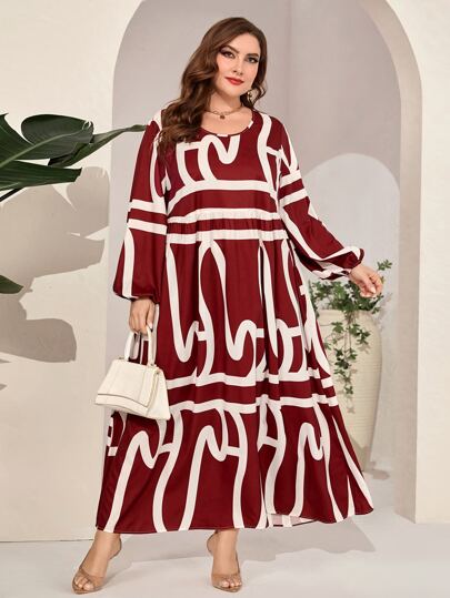 Al Najma 勃艮第红色加大码满版印花灯笼袖罩衫连衣裙 - 酒紅色 - 查看 1