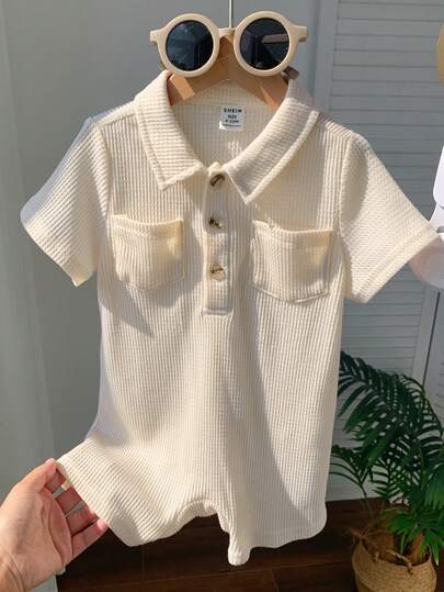 SHEIN 新生男宝宝夏季可爱针织短袖连体衣,适合生日派对、晚宴、演出、婚礼、满月庆祝、洗礼和一周岁宝宝派对等场合。 - 卡其色 - 查看 4