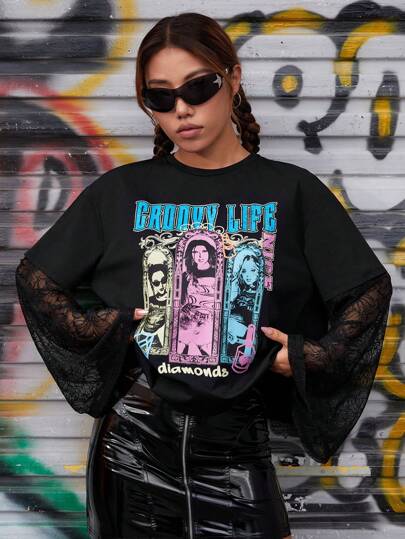 SHEIN PETITE 字母人物圖案蕾絲拼接T恤 - 黑色 - 查看 1