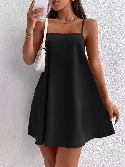 SHEIN PETITE 纯色吊带连衣裙 - 黑色 - 查看 1