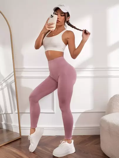 SHEIN PETITE 素色高腰緊身打底褲 - 藕粉色 - 查看 1