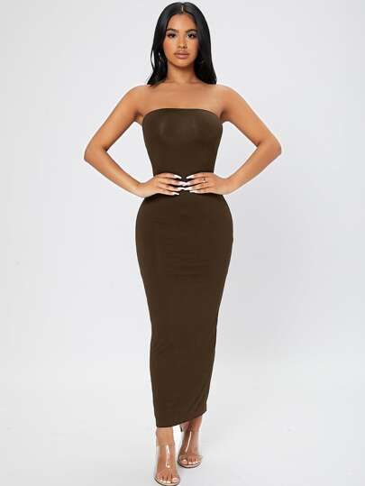 SHEIN PETITE 後背開衩抹胸洋裝 - 巧克力棕 - 查看 1