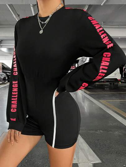 SHEIN PETITE 女性字母圖案撞色滾邊連身褲 - 黑色 - 查看 1
