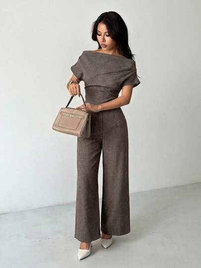 SHEIN PETITE 女士夏季新款简约优雅日常休闲亚麻通勤宽领露肩上衣搭配阔腿裤套装 - 咖啡棕 - 查看 1