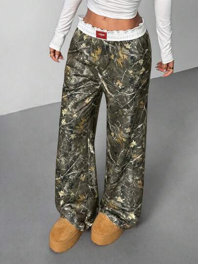 SHEIN PETITE 女士树枝图案阔腿休闲裤 - 軍綠色 - 查看 1