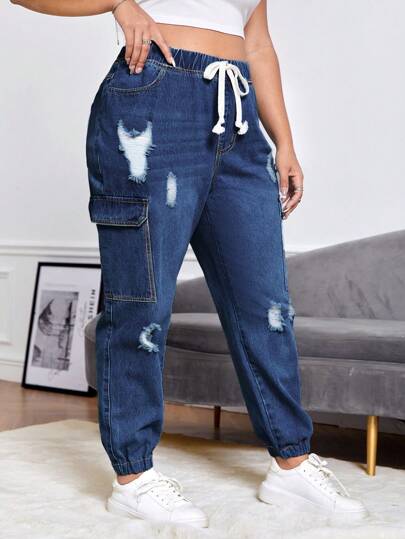SHEIN 大碼腰部抽繩破洞側翻蓋口袋工裝牛仔褲 - 深色水洗藍 - 查看 1