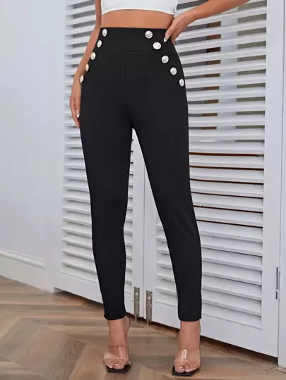 SHEIN Privé 高腰紐扣細節緊身褲 - 黑色 - 查看 1