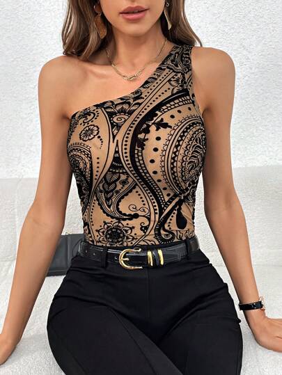 SHEIN Privé 佩斯利印花單肩上衣 - 彩色 - 查看 1