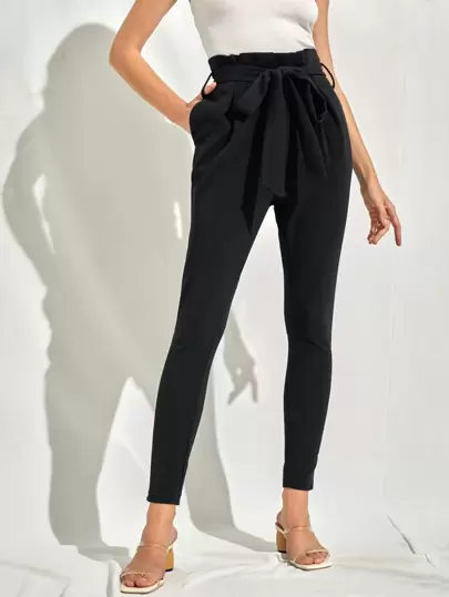 SHEIN Privé 紙袋腰自腰帶傾斜口袋褲子 - 黑色 - 查看 1