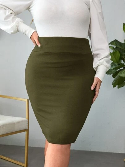 SHEIN Privé 大碼高腰包臀半身裙 - 軍綠色 - 查看 1