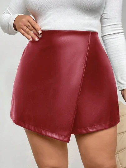 SHEIN Privé 大码休闲舒适 PU 皮革短裤,时尚简约,适合日常穿着、春秋季节 - 酒紅色 - 查看 1