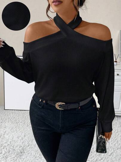Celure 大尺碼女士綁頸領設計運動衫 - 黑色 - 查看 1