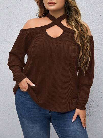 SHEIN Privé 女式大尺碼休閒簡約娃娃領方格紋開肩鑲空格紋交叉紋帶T恤 - 棕色 - 查看 1