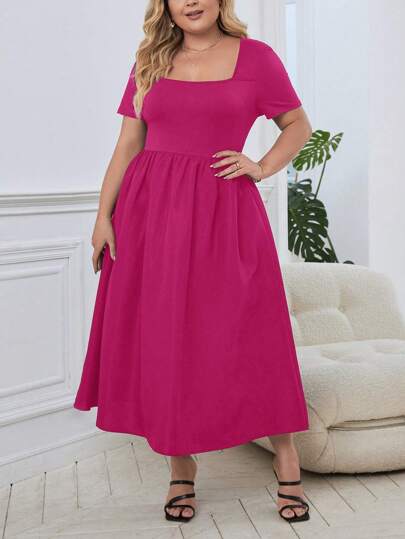 SHEIN Privé 大碼方領A字洋裝 - 玫紅色 - 查看 1