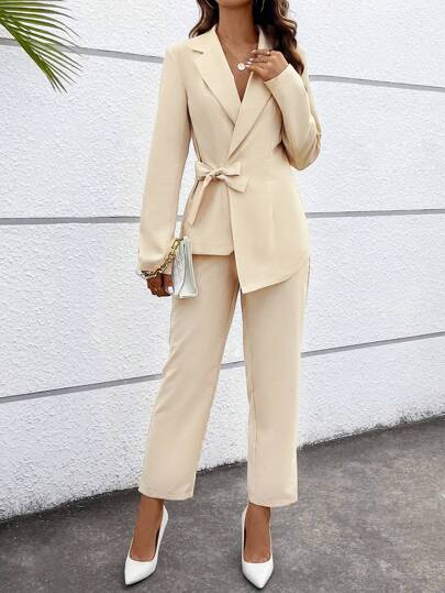 SHEIN Privé 尖領蝴蝶結西裝外套和褲子套裝 - 杏色 - 查看 1