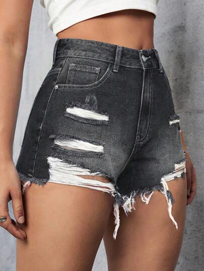 SHEIN Privé 夏季休闲洗水破洞牛仔短裤 - 深灰色 - 查看 1