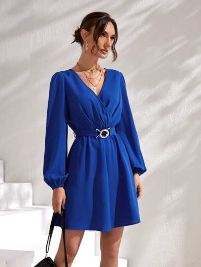 SHEIN Privé 交疊領燈籠袖繫腰帶洋裝 - 寶藍色 - 查看 1