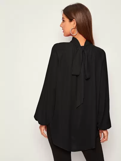 SHEIN Privé 後繫帶插肩燈籠袖弧形下擺上衣 - 黑色 - 查看 1